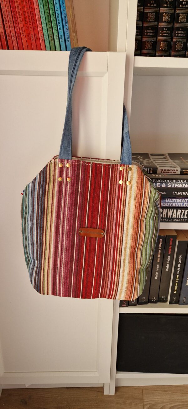 Super sympa ce sac cabas réversible qui donne l’avantage d’avoir deux sacs en un ! Un coté en tissu d’ameublement rayé bayadère multicolore et l’autre côté en tissu d’ameublement naturel : de quoi changer au gré de votre humeur du jour.