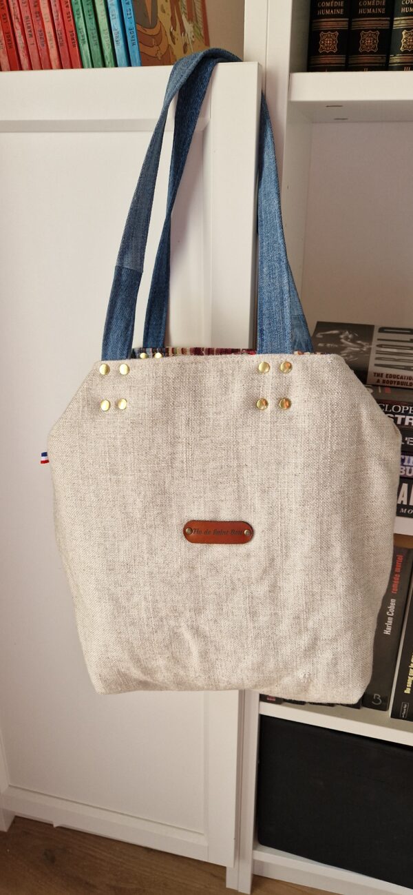 Les anses sont en jean upcyclé fixées par des rivets, et deux petites bandes de tissus permettent à l’intérieur de fermer le sac avec un petit mousqueton.